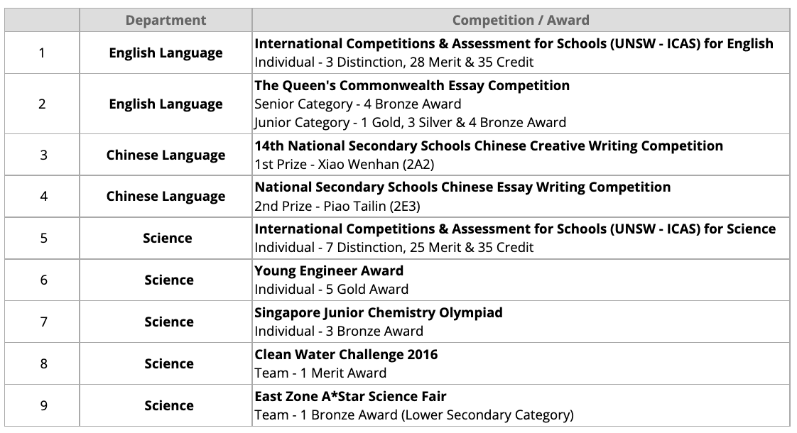 | 5 | Science | 43rd International C.B. Paul Science Quiz- Sec 2 (2 Silver, 1 Bronze) - Sec 4 (1 Silver, 1 Bronze, 3 Merit) Biology Olympiad - 3 Bronze - 2 Honorable Mention Physics Olympiad - 1 Bronze - 7 Honorable Mention 9th ASEAN Plus Three Junior Science Odyssey (APTJSO) - 1 Gold (Mixed Country team) - 2 Silver (for Science Process Skills Challenge, and Sustainability Challenge) 2022 East Zone ASTAR VJC Science Fair - Merit (Sec 2 Team) |