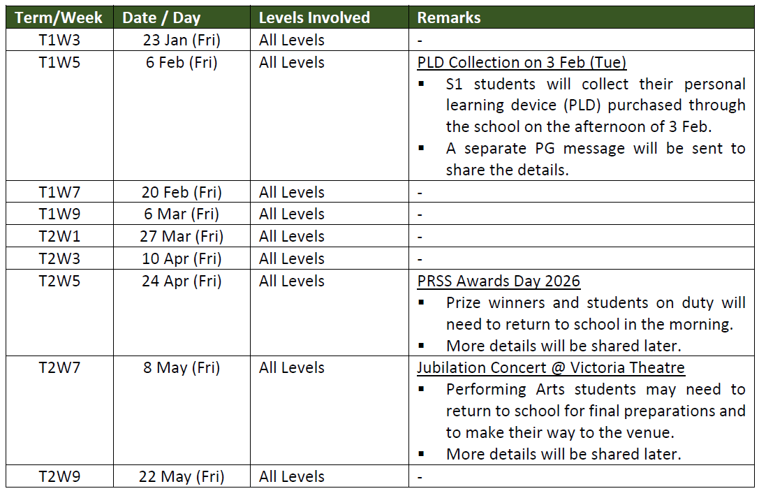 The 2026 fortnightly Blended Learning (BL) Days will commence from 23 January (Friday). Students will also participate in at least 1 hour of Student-Initiated Learning (SIL) activity on BL Days to explore an area of interest within or beyond the curriculum. Please refer to the table below for the BL Day schedule in Sem 1.