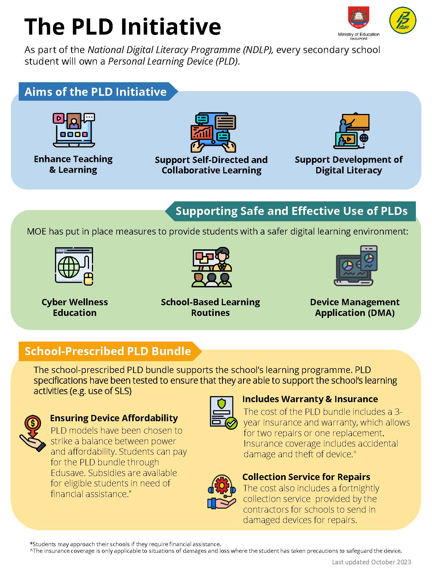 At MOE’s Committee of Supply Debate in March 2020, MOE launched the National Digital Literacy Programme (NDLP) for our schools and Institutes of Higher Learning to help students strengthen their digital literacy. One of the components of the NDLP is the introduction of the Personalised Digital Learning Programme (PDLP) for all secondary school students, whereby every secondary school student will own a school-prescribed computing device or Personal Learning Device (PLD) by end-2021.
